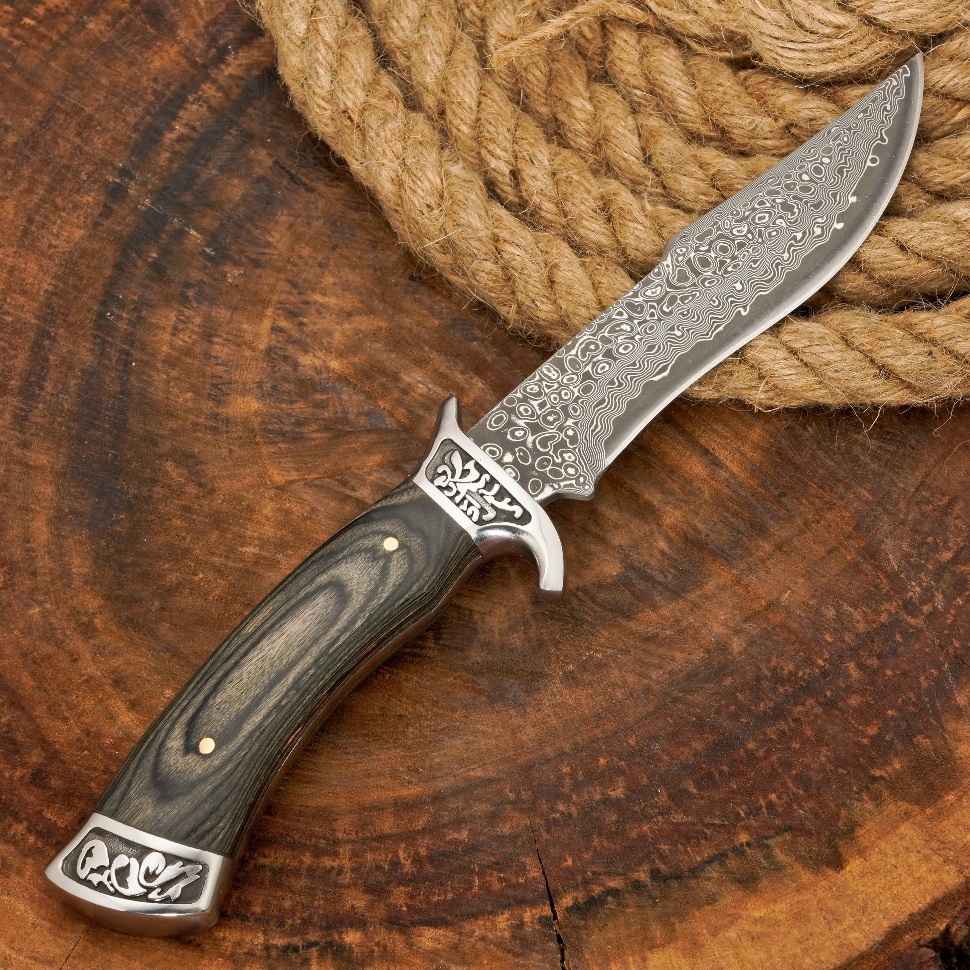 Coltello da caccia in acciaio di Damasco forgiato a mano | Coltello a codolo intero