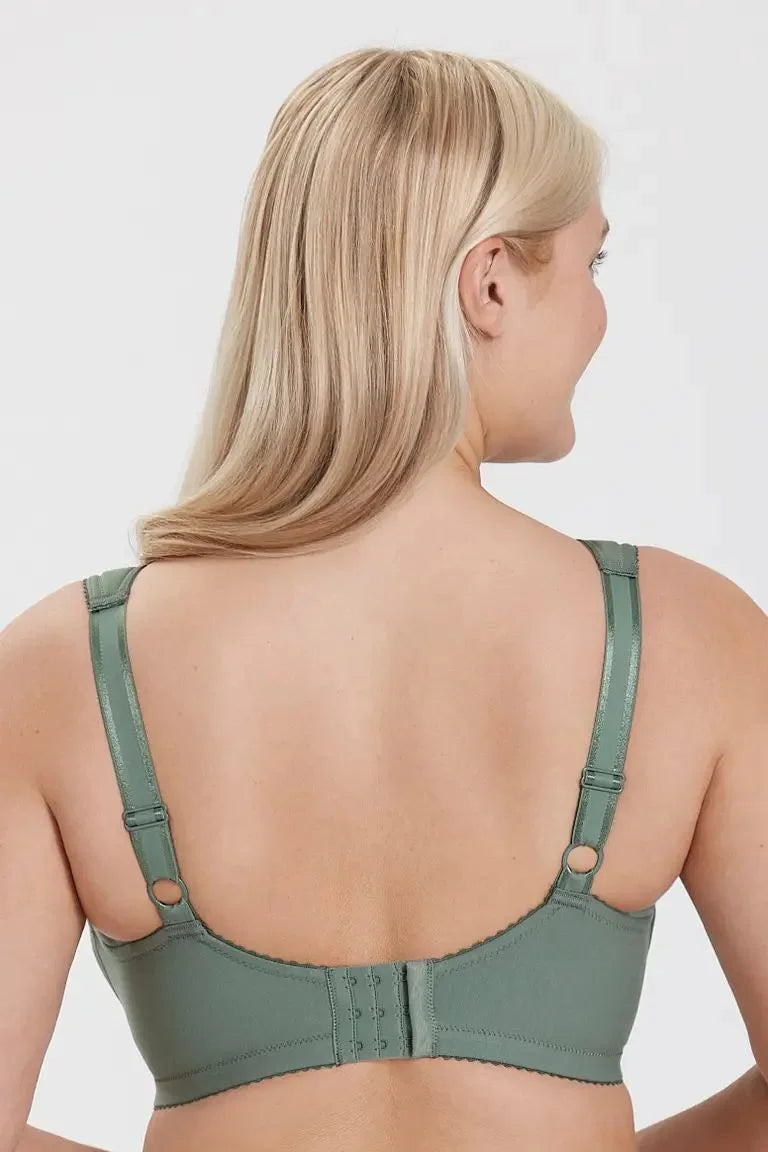 Comodo reggiseno senza ferretto con coppe in cotone e parte superiore in pizzo elasticizzato riciclato. Ha un elastico largo sotto il seno per un comfort extra. L'elastico è regolabile. La parte posteriore è in pizzo riciclato e ha una fodera in cotone. Può essere utilizzato con cerotti adesivi e inserti assorbenti.